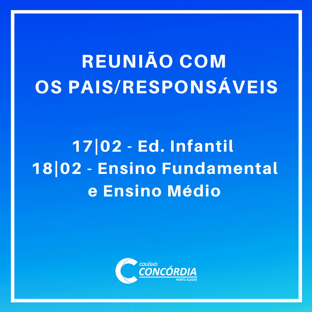 Na segunda, às 18h40, acontece a Reunião com os pais/responsáveis pela Ed. Infantil. Já na terça, também às 18h40, acontece a Reunião Geral com os pais/responsáveis do Ensino Fundamental e do Ensino Médio.