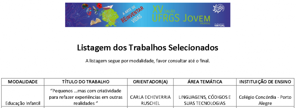 O Colégio Concórdia de Porto Alegre teve dois trabalhos selecionados na edição de 2020 do Salão UFRGS Jovem. Os projetos “Pequenos, mas com criatividade para refazer experiências em outras realidades”, da Educação Infantil, e “Adolescentes Vegetarianos: uma escolha consciente ou uma febre do momento?”, do Ensino Fundamental II, já podem ser conferidos no site do evento. Neste ano, o Salão UFRGS Jovem acontece totalmente online com a exibição de vídeos das pesquisas. Os trabalhos selecionados do Concórdia podem ser conferidos no link http://www.ufrgs.br/propesq1/ufrgsjovem2020/buscador/ – basta digitar “Colégio Concórdia Porto Alegre” na busca.