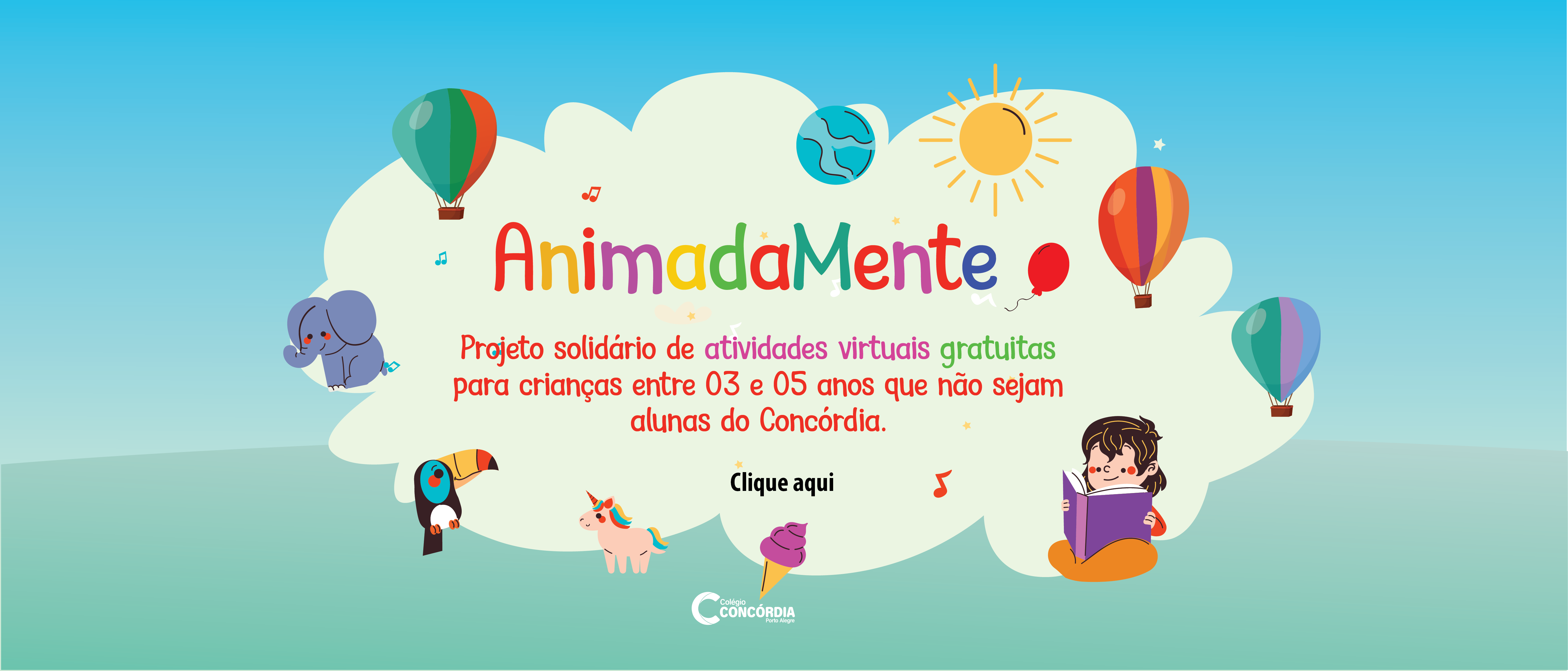 O ANIMADAMENTE é um PROJETO SOLIDÁRIO de ATIVIDADES VIRTUAIS GRATUITAS voltadas às crianças que tenham entre 03 e 05 anos que não são alunas do Concórdia e para escolas de Educação Infantil (Zona Norte e Centro de Porto Alegre) que ainda não tenham uma plataforma de aprendizagem virtual.