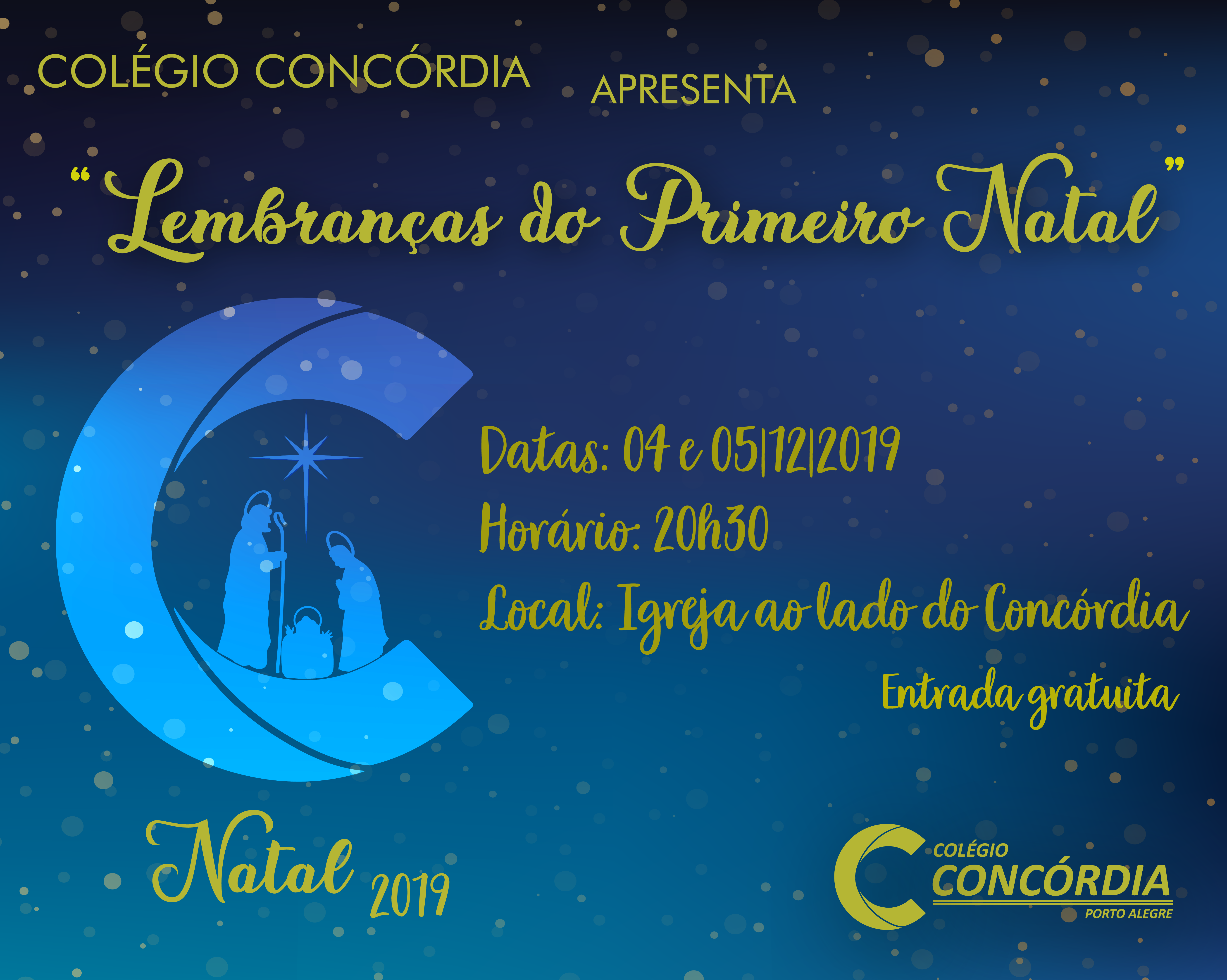 As apresentações de Natal do Colégio Concórdia acontecem na próxima quarta e quinta-feira (04 e 05/12). Com o tema “Lembranças do Primeiro Natal”, o evento acontecerá na Igreja ao lado do Concórdia e inicia, nos dois dias, às 20h30. As turmas estarão divididas nas duas noites de apresentações.