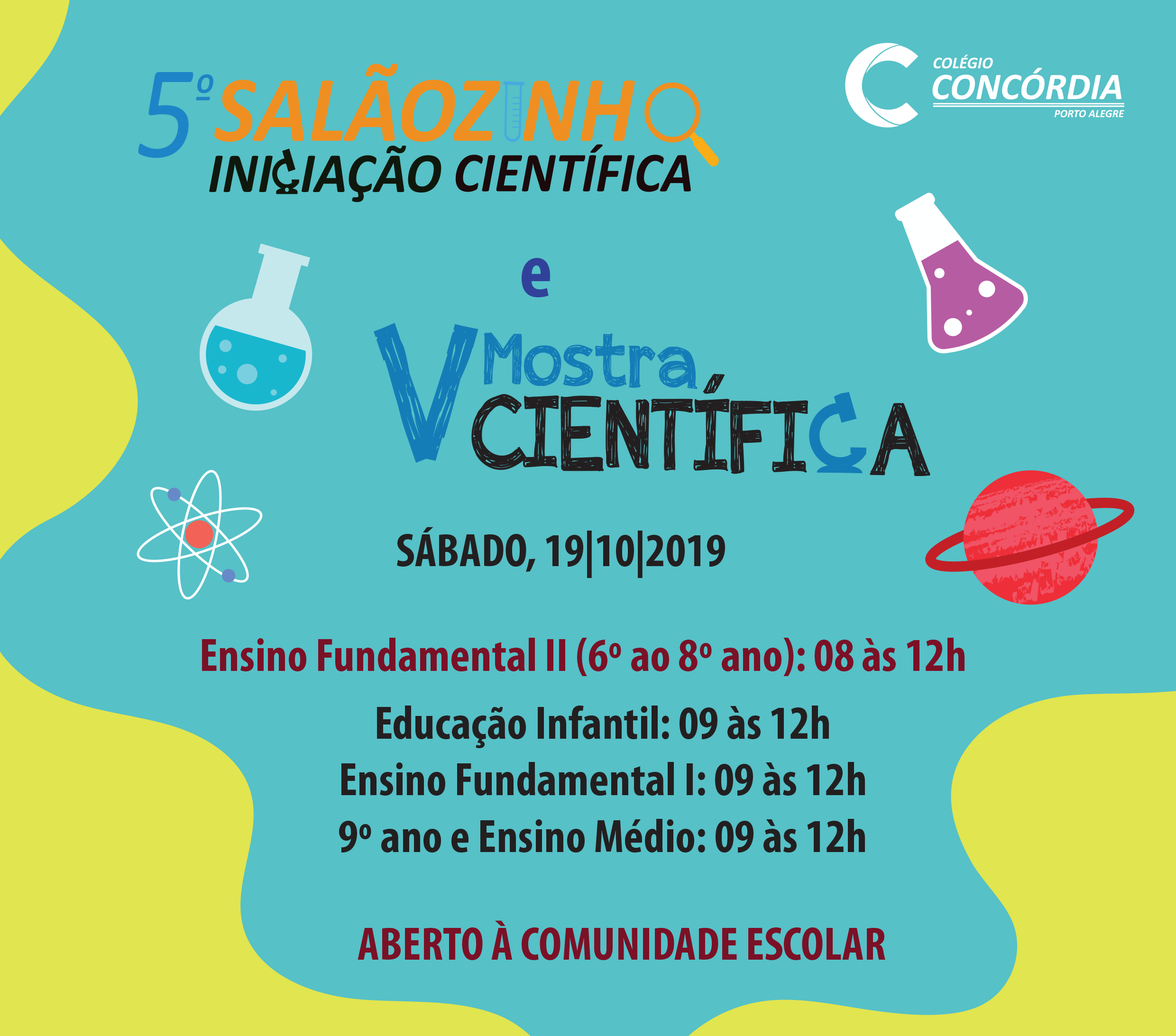 O 5º Salãozinho de Iniciação Científica e a 5ª Mostra Científica do Colégio Concórdia acontecem no próximo sábado, 19/10. No dia, estudantes da Educação Infantil ao Ensino Médio irão apresentar os resultados dos trabalhos e pesquisas científicas desenvolvidas ao longo do ano com a orientação dos professores.